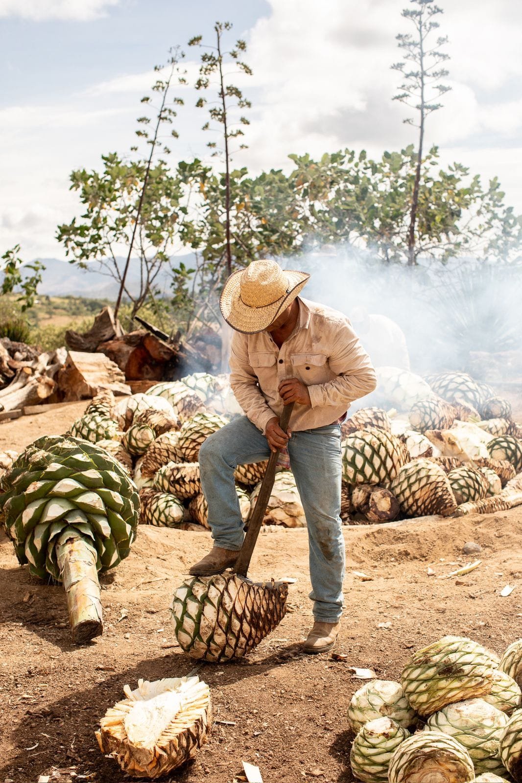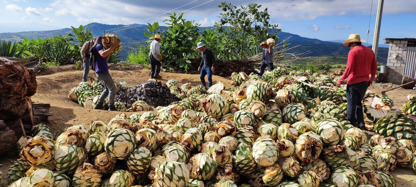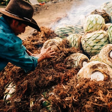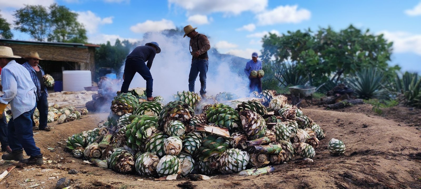 Los corazones de maguey se cuecen lentamente bajo tierra, sobre piedras calientes y cubiertos con tierra y hojas. Este proceso puede durar varios días y es clave para desarrollar los sabores profundos del mezcal.