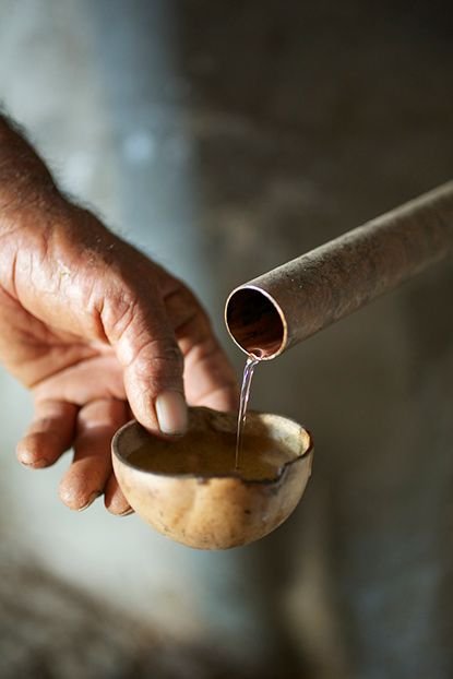 Finalmente, el líquido fermentado se destila lentamente en alambique de cobre, donde se separa lo más puro del mezcal, cuidando cada corte para mantener la esencia del agave.